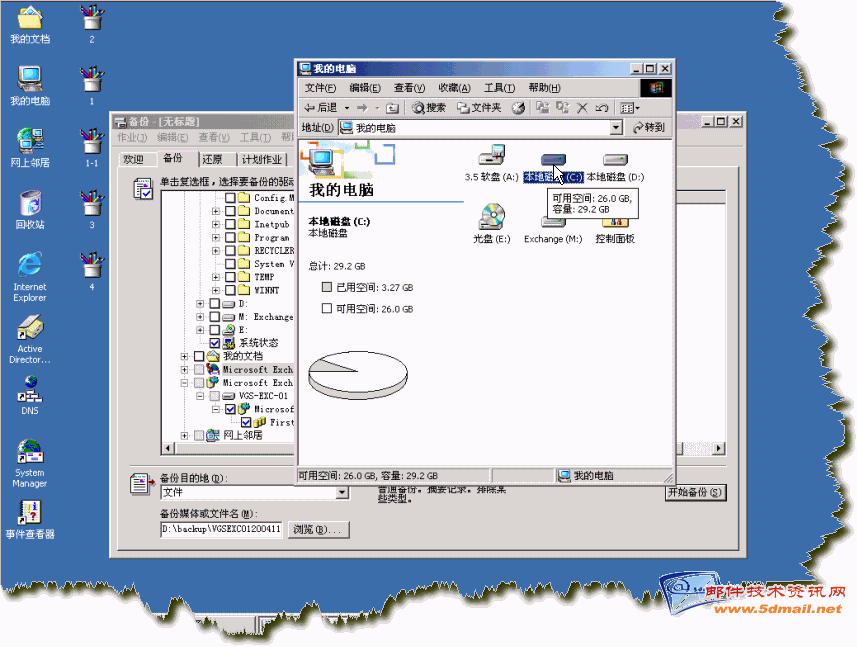 如何处理这些检查点文件,以得到更多的磁盘空间呢?你可能会想到手动删除它们?钉子建议你千万不要有这种的打算,为什么?在Yinjie的文章中对检查点文件与Exchange的EDB和STM数据库文件的关系,已做了比较详细的说明。我们建议的作法是制定有效的备份计划,对Exchange存储组进行备份,实现有效减少LOG文件,得到更多的磁盘空间。刚好今天在做这方面的工作,所以把过程抓了下来,希望对大家有所帮助。